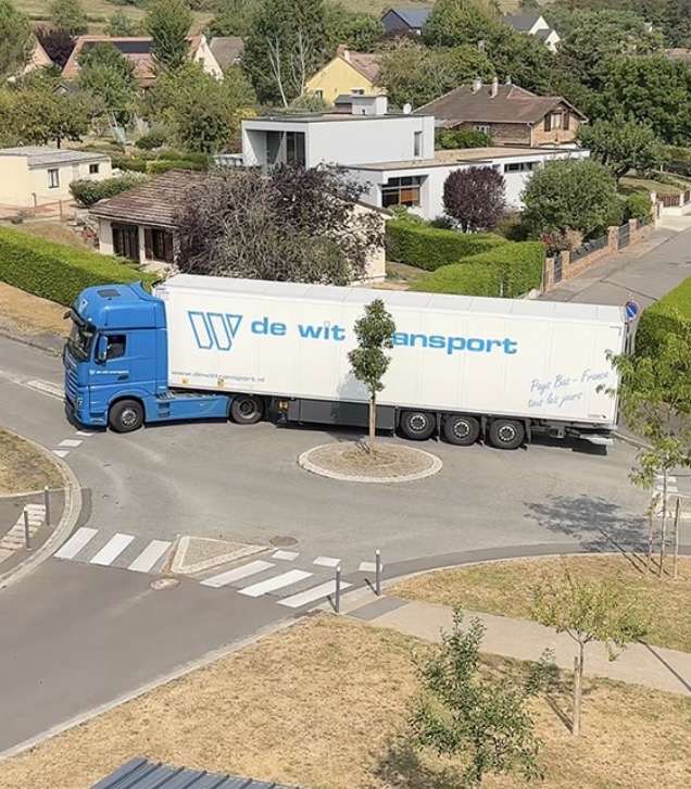 Hollantilainen kuorma-autonkuljettaja De Wit Transportista kohtasi Romaniassa odottamattoman haasteen. Risteyksessä oli laitettu pieni liikenneympyrä, jonka keskelle oli istutettu pieni puu.